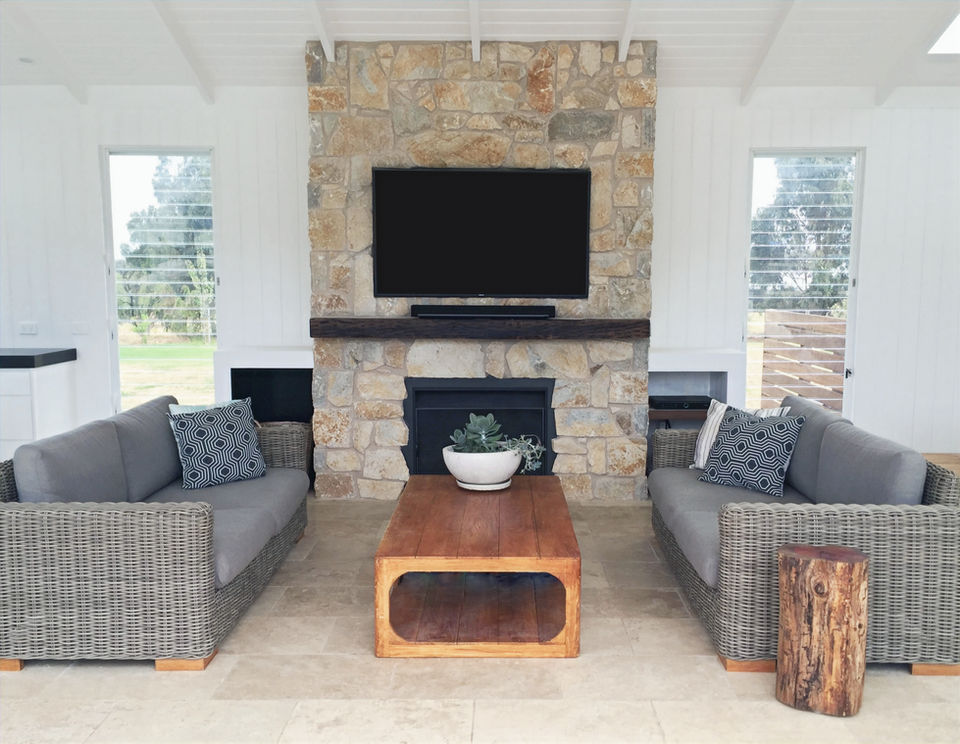 MESHING COUNTRY CLASSICS OF FACE CUT STONE AROUND THE FIREPLACE WITH TIMELESS BEACHSIDE TIMBER PANELING AND WICKER, WE’VE CREATED A POOL HOUSE THAT FEELS JUST AS AT HOME HERE IN THE COUNTRY, AS IT WOULD BY THE SEA.